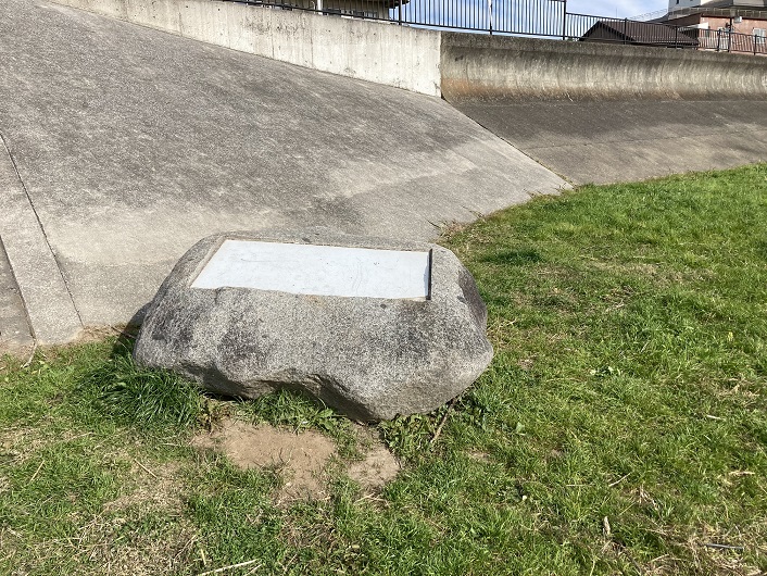 たまリバー50キロコースのスタートポイントが案内板のある堤防上の遊歩道の地点になるのか、あるいは河川敷のどこかになるのか判断がつきません。とりあえず、近くの階段を下りて河川敷に何か標識がないか探します。すると、階段下に大きな石が置いてあります。明らかに自然の岩ではありません。石の上には何かが書かれたような痕跡は見られますが、表面がはげ落ちていて何が書かれていたのか判別できません。ひょっとしたら、これが「たまリバー50キロ」の標識かも?いやいや、単なる大師橋緑地の銘板?周囲の河川敷を見渡しても、この石の他には標識らしきものは何も見当たりません。仕方がないので、この石碑を「たまリバー50キロ」のスタートポイントと決めます。
