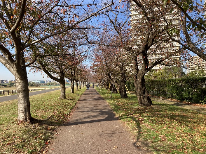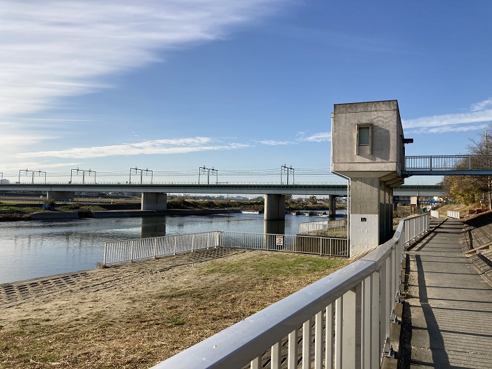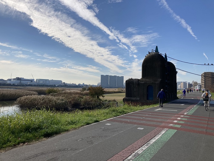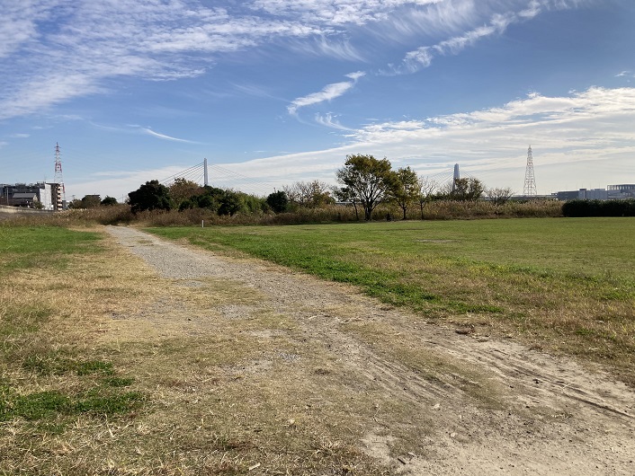 土手が急に広くなったところに出ました。高規格堤防というのだそうです。荒川でも見ましたが、400年に一度の大雨にも耐えられるのだとか。もっとも、全ての区間が高規格堤防にならないと意味ないのですけど。