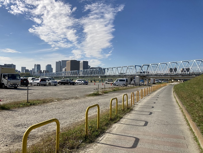 六郷橋の少し上流には、京浜急行多摩川橋梁(476m)・東海道本線と京浜東北線の六郷川橋梁(519m)の3本の鉄橋が架かっています。橋長は長いのですが、通常はその大半の区間が河川敷になっています。河川敷は駐車場になったり運動場になったりと、あまり鉄橋を感じさせません。