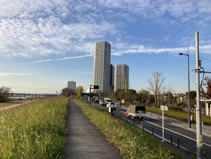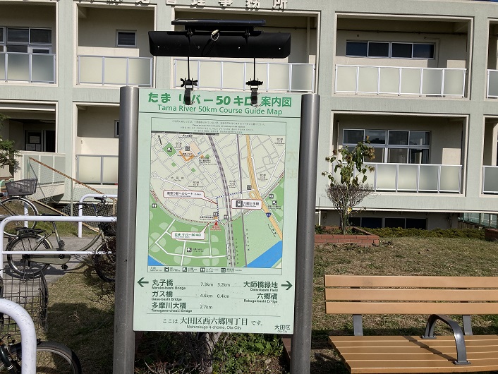 東京都キ市整備局のHPには、羽村取水堰から大師橋緑地までのたまリバー50キロの全区間に渡っての詳細なコースマップが公開されています。玉川上水と違って、基本的に多摩川の河川敷や土手上の遊歩道を歩くので道に迷うことはありません。コースマップには経過距離や最寄りの公共交通機関へのアクセス方法も図示されていますので、事前に計画を立てる上でとても参考になります。コースマップによりますと、大師橋緑地をスタートポイントとした場合、余裕をみて東横線の多摩川駅に近い丸子橋辺りを一日目のゴールとした方が良さそうです。頑張れば二子玉川駅横の二子橋まで行けるかもしれません。