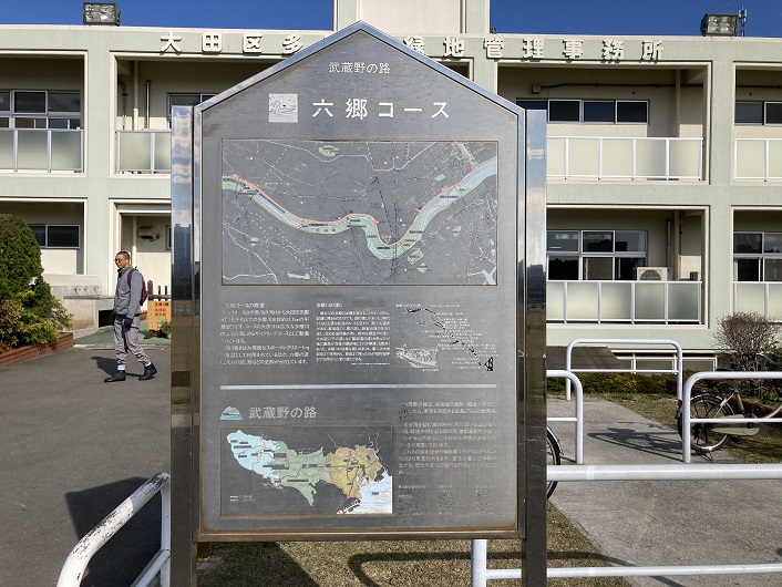 その隣りに武蔵野の路の案内板も置かれていました。河口から丸子橋までの多摩川最下流の区間は六郷コースになっていて、10年ほど前に歩きました。記憶は大分薄れていますが、景色は何も変わっていない感じがします。