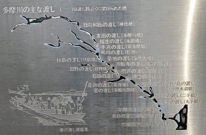暴れ川の多摩川は橋を架けることがむづかしく、記録に残るものだけでも、38の渡しがあった。時代とともに主要な街道のルートも変わり、渡しにも盛衰がある。東海道の六郷の渡し、鎌倉街道の矢口の渡し、日光街道拝島の渡し、相州往還登戸の渡し、大山道二子の渡しなど諸街道の渡しも栄えたが、他に農民が対岸の農耕地に行く作業渡しも数多くあった。多摩川の主要な渡しの多くは、第二次大戦前後まで使用され、最後まで残ったのが昭和四十八年まで利用された菅の渡しである。