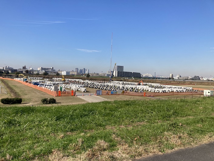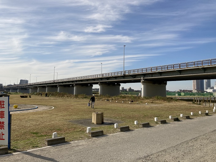 広大な河川敷にはテトラポットも山積みされています。六郷橋から上流の京急とJRの鉄橋付近は六郷テトラ地帯とも呼ばれていて、手長海老などの釣り場になっているのだそうです。増水時には治水、平常時には釣りと、いろんな面でテトラポットは貢献しているのですね。