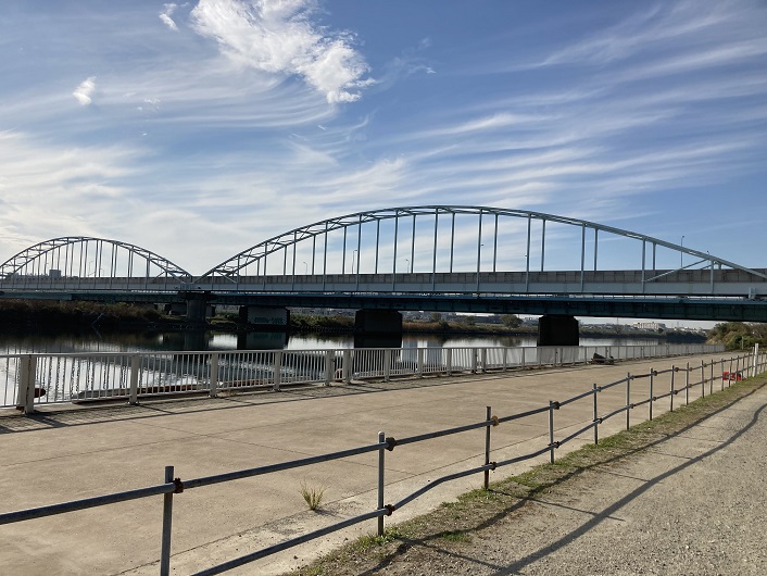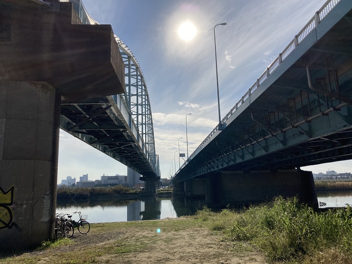 目の前に大きな多連のアーチ橋が架かっています。国道1号線(第二京浜)が通る多摩川大橋です。遠くからは1本の橋に見えたのですが、橋の下から見ると2本の橋に分かれています。河口側の橋は、東京電力とNTTが共同で使用する送電専用の橋です。上流側の橋が多摩川大橋になります。送電専用のためにこんな立派な独立した橋が必要なのでしょうか?