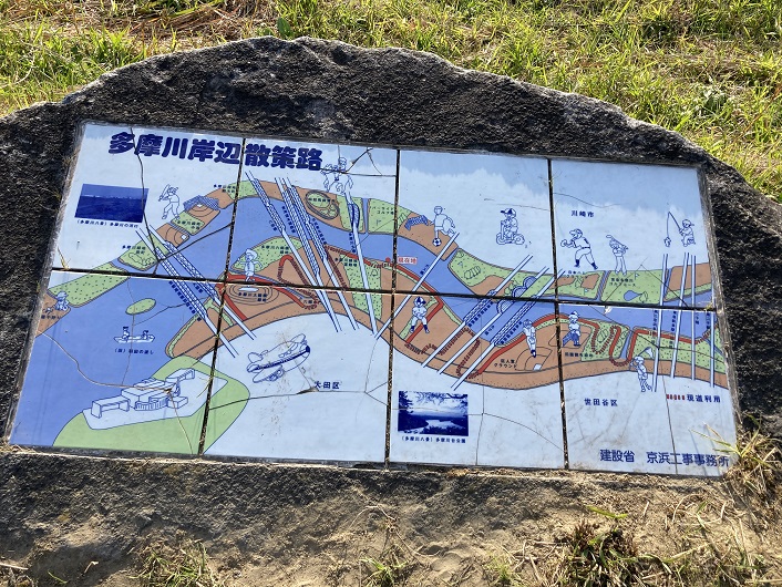 河川敷には「多摩川 岸辺の散策路」の標識と地図が置かれています。岸辺と言いますから、本当に川辺に設けられた雑草の中のあぜ道です。