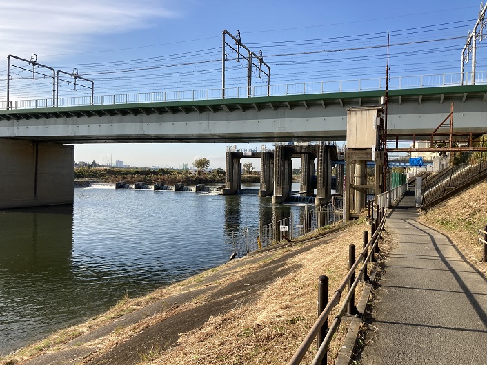 目の前に丸子橋が見えてきました。時刻は午後2時です。多摩川の歩きを続けるかどうか判断が難しいところです。この先、電車で帰るには二子橋まで歩くしかありません。丸子橋から二子橋までは2時間弱かかる筈で、「秋の日はつるべ落しの如くなり」の通り、調子に乗って写真なんかを撮りまくっていたら二子橋は夕闇に沈んでしまいます。丸子橋なら直ぐ近くの東横線の多摩川(もう園は付かないのか。。。)駅から帰れます。暫し熟慮し、これから先の行程も考えて二子橋まで歩くことにしました。丸子橋の下をくぐり、ルビコン川を渡ります。ちなみに、ルビコン川とは、古代ローマ帝国時代に存在した川で、イタリア本土と属州ガリア・キサルピナとの境界線の役割を果たしていました。軍団を率いてこの川を越え南下することは法により禁じられており、禁を破ればすなわち共和国に対する反逆とみなされていたのです。紀元前49年1月10日、ローマ内戦においてユリウス・カエサル(ジュリアス・シーザー)が元老院の命令に背き、軍を率いてこの川を渡った故事によって知られていて、この際に「賽は投げられた」と部隊に檄を飛ばしたことはあまりにも有名です。「ルビコン川を渡る」という言葉は、その後の運命を決め、後戻りのできないような重大な決断・行動をする比喩として使われています。ま、私の場合はそれほどの意味はありませんけどね。丸子川が多摩川に合流する地点に設けられた樋門の先に東急東横線・東急目黒線の鉄橋が見えます。