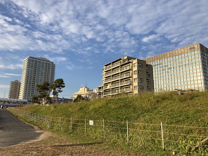 多摩川は西六郷辺りで大きく蛇行して流れています。川が流れる方向を変えるところでは、当然のことながら増水時に水の圧力を受けます。従って、堤防はより頑丈にしなければなりません。この辺りは堤防も堤防沿いの道路も真新しく、昔から継続的に護岸工事が行なわれていたようです。