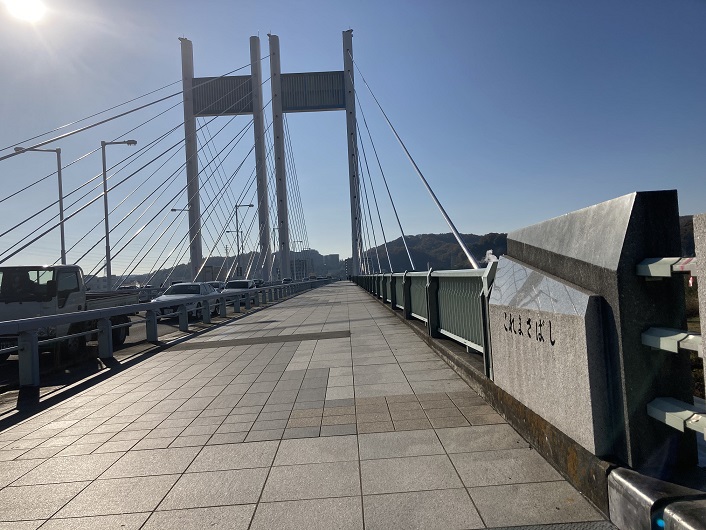 京王線の多摩川橋梁の先には府中四谷橋が架かっています。府中四谷橋は斜張橋という形式で、2本の主塔とそこから張り出された橋桁を支える白いケーブルが三角形を成し、とても美しい姿をしています。