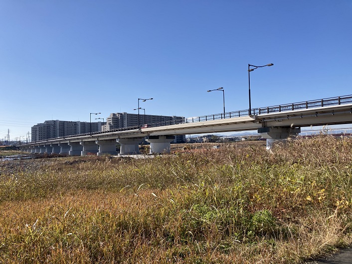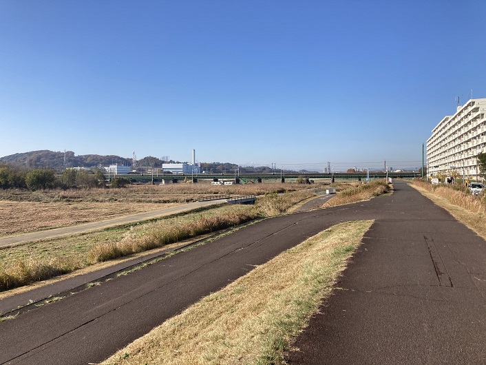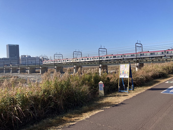 今日は今年一番の晴天ではないかと思えるほど空が晴れ渡っています。雲ひとつないという言い方がふさわしい空の碧さです。おまけに小春日和でポカポカと暖かいですね。厚手の上着が邪魔になるほどです。堤政橋から羽村堰を目指して多摩川の土手の上を歩き始めます。視界の先に南武線の多摩川橋梁が見えてきました。遠目には1本の鉄橋に見えますが、実際には2本の鉄橋が隣り合って架かっています。一方は南武線、もう一方は武蔵野貨物線です。稲城方面から来た武蔵野貨物線は多摩川橋梁手前で南部線と並走し、府中本町駅で武蔵野線(貨客混合線)に合流します。