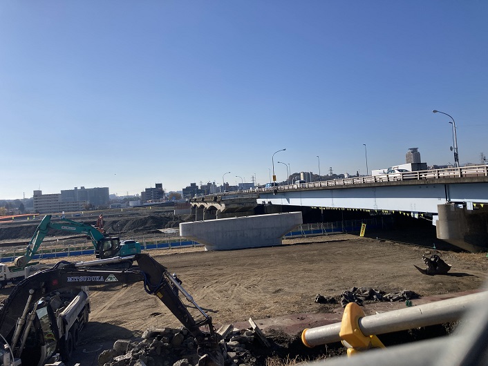 - 下流側の旧橋を撤去した跡地に新橋が完成し、その後上流側の橋の改築工事が行なわれ、仮橋撤去を経て全面完成予定です。