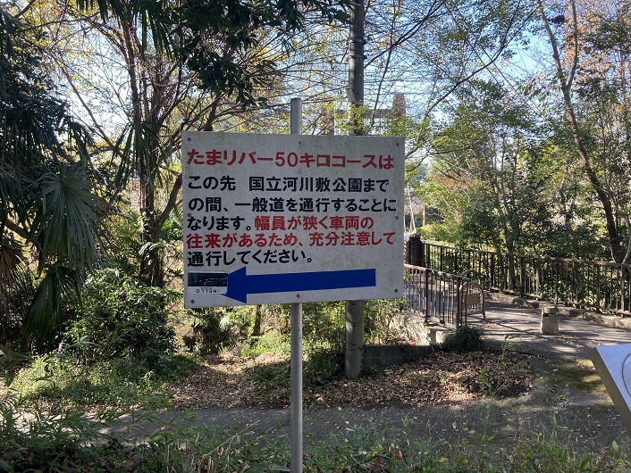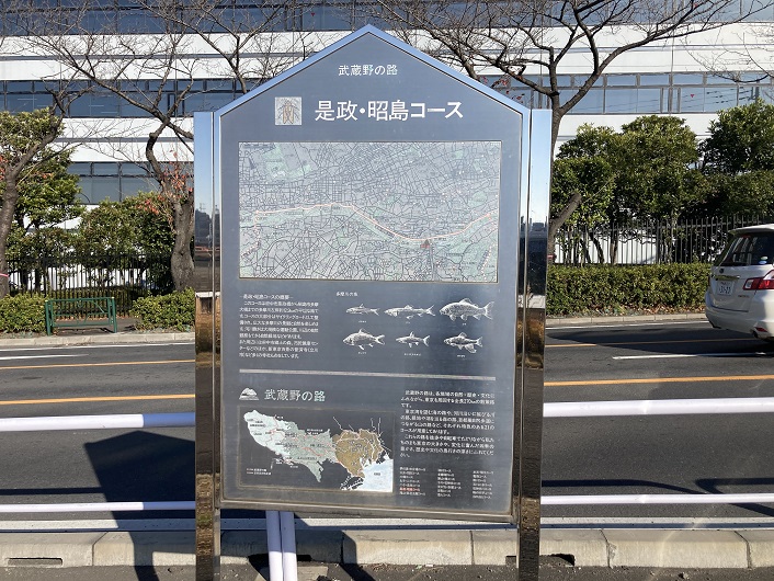 たまリバー50キロコース上には、武蔵野の路の案内板が幾つも設置されています。堤政橋から多摩大橋までの区間は「是政・昭島コース」となっていて、周辺の名所・旧跡などが紹介されています。単なる観光案内ではなく、野鳥・川魚・草花など、多摩川の自然にも興味がそそられるような内容になっています。