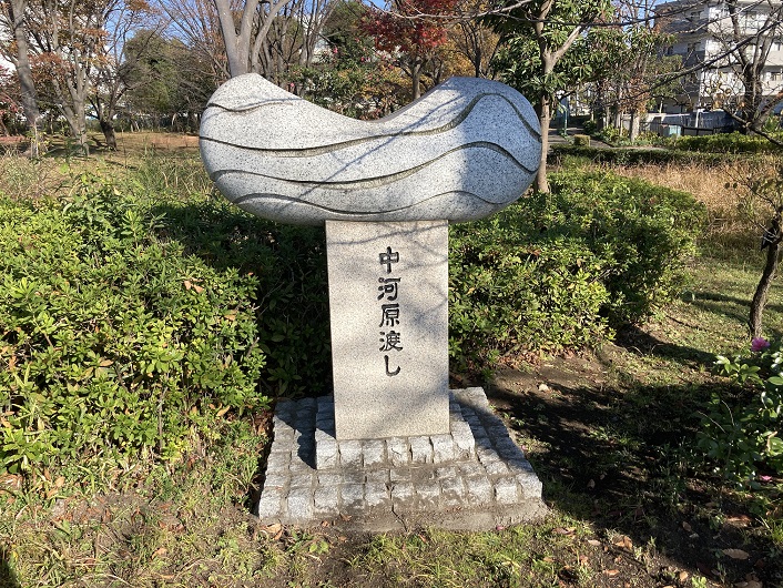 関戸の渡しは府中市側では「中河原渡し」と呼ばれていましたが、遊歩道を下りて多摩川通りを渡った先の公園にその石碑が置かれていました。石柱の上の小惑星イトカワのようなオブジェは「渡し」の石碑に共通して冠されているみたいです。