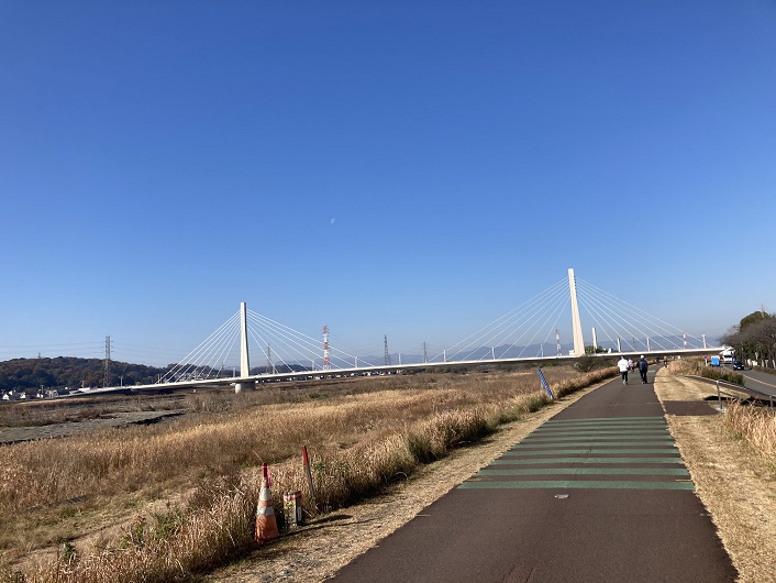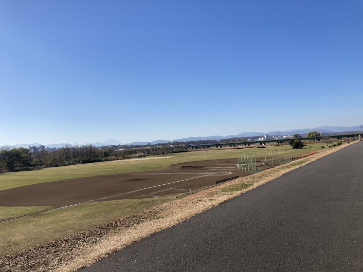 関戸橋が近づいてきました。10年ほど前に「歴史と文化の散歩道」の府中国分寺コースで渡った橋です。都道18号府中町田線が通っていますが、名称としては鎌倉街道の方が一般的です。関戸橋は、この橋の近くにあった関戸の渡し(府中市側では「中河原渡し」となります)の代替として昭和12年(1937年)に架橋され、橋の名前は南岸の多摩村関戸(現在の多摩市関戸)に因んで名づけられました。関戸橋の多摩側には聖蹟桜ヶ丘の街並みが遠望でき、高層ビルの間からは富士山が拝めます。今日は本当に最高のお天気です。