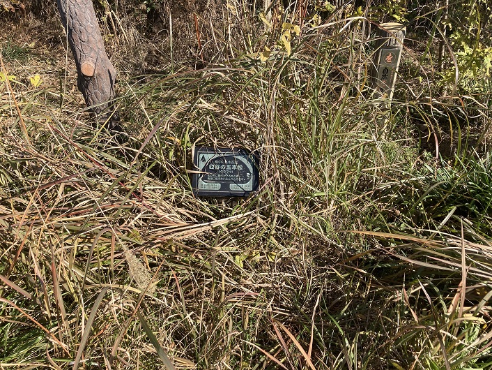 遊歩道の脇の草むらに小さなプレートが置かれていました。近づいてみますと、府中の名木百選のひとつ、四谷の五本松と書かれています。