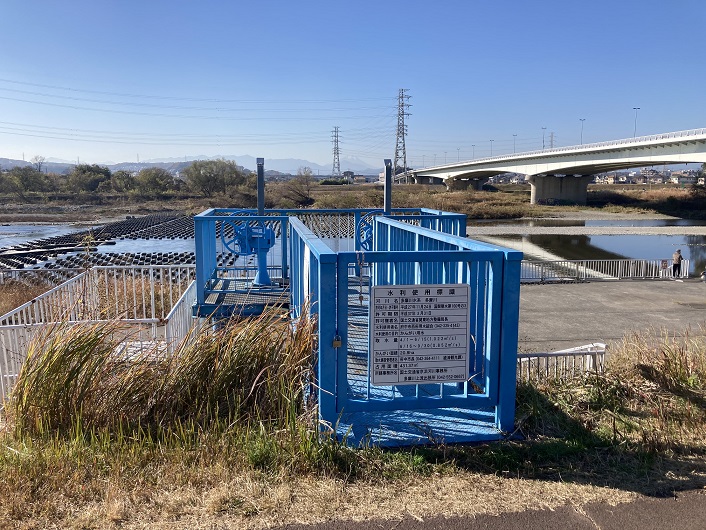 多摩川橋の少し上流の小高くなった土手の下に水門が見えます。立て札には緑川排水樋管と書いてあります。緑川なんてどこにあるんだろうと周囲を見渡しますが、それらしき川は見当たりません。家に帰って調べてみましたら、「緑川は昭和二十二年に通水された人工河川で、最初は「立川排水路」と呼ばれていました。旧陸軍立川飛行場付近(現在の昭和記念公園)の水はけが悪く、洪水対策の排水路として設けられました。現在は全区間暗渠ですが、完成当時は開渠で今も橋の遺構などが残っています。現在は下水幹線となっていますが、通常は水が出てくることはありません。」とのことです。