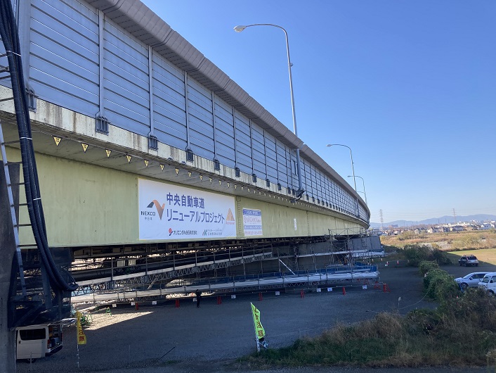 石田大橋の少し上流には中央自動車道の多摩川橋が架かっています。多摩川の上を跨いでいるのに防音壁らしきもので覆われていますね。風避けかな?