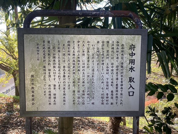 府中用水は、多摩川の水を青柳南で取り入れ、谷保南部を通り、府中まで導く農業用水路です。江戸時代には、府中宿のうち本町・番場宿・新宿と、是政村・上谷保村・下谷保村・青柳村の合計七カ村が管理していたため、七ケ村組合用水」と呼んでいました。いつ、どのように造られたかについては明らかではありませんが、一説には、江戸時代(1652年頃)に羽村の玉川兄弟が、青柳から府中までの上水路を計画し、途中まて掘り進んだところ土地の高低差が激しく断念、後の人がその跡を利用したと伝えられています。また一説には、昔の多摩川の河床を用水路として利用したとも伝えられています。この下が用水の取入口です。毎年、田植えの前に水を取り入れ、田を潤し、秋の収穫前に水を止める光景が風物詩となっています。