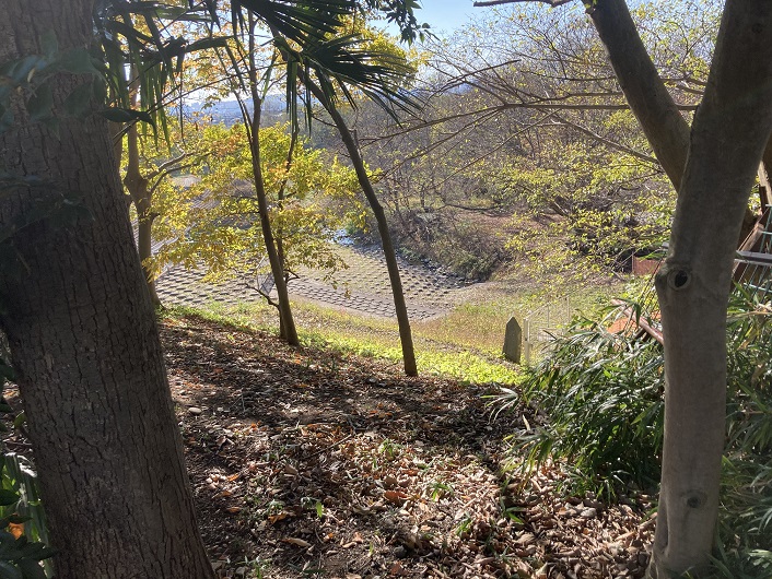 民家の間を抜けると、砂利道は左に折れて坂を下ります。江戸時代の始め、江戸日本橋と甲府を結び、その後下諏訪まで整備された甲州街道は立川市の南側を多摩川と平行に走り、時代によって場所が変わる「渡し」場所から多摩川を越えたのだと言われています。「渡し」の場所が移動すると、その都度「甲州街道」も道筋を変えながら、現在は「日野橋」で多摩川を渡っています。日野の渡しがあった頃、この段丘崖下を流れる多摩川を越えるためには多摩川の河原に下りるしかありませんでした。その際、河原に下りるために使われていた坂のことを「貝殻坂」と呼んでいました。