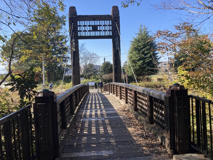 貝殻坂を下りた先に古風な木製の吊り橋が架かっています。たまリバー50キロで出会った最も印象的な橋です。根川貝殻坂橋という名前ですが、主塔から手摺り・床板に至るまで全て木材でできています。周囲の景観によく溶け込んでいて絵になります。