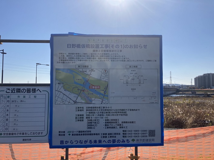 日野の渡しは日野橋の架橋によって廃止されましたが、その日野橋は老朽化が進み、2020年11月から架け替え工事の第一弾として仮橋設置工事が開始されました。日野橋は大正十五年・昭和元年(1926年)の架橋から90年以上が経過し、拡幅工事や補強工事などで設計基準の改定に伴う対策を行なってきました。近年では平成23年(2011年)9月の台風で護床ブロックが流出し、平成三十一年・令和元年(2019年)の台風19号(令和元年東日本台風)では橋脚1本が流出し、翌年5月までの約7ケ月間の通行止めが発生しました。東京都では、近年の大雨の発生状況を鑑み、長期的な安全を確保するために老朽化が進行している日野橋を架け替えることを決定しました。現在の日野橋は径間が多く、河川内には18本もの橋脚が設置されていますが、新たな橋は3径間とすることで河川内の橋脚を2本に削減します。地域のシンボルとなる美しい斜張橋として生まれ変わる予定です。仮橋の建設は集中豪雨や台風の多い時期を避け、約3年をかけて建設されます。その後、約7年をかけて現在の日野橋の撤去ならびに新橋の建設工事を行い、約10年後に新たな日野橋が開通する予定です。