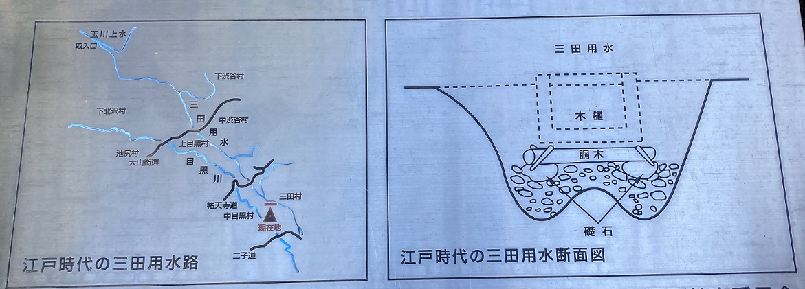 三田用水は、かつて世田谷区北沢から目黒区三田方面を経て白金猿町に流れていた用水路で、既に廃止されています。世田谷区北沢(旧・下北沢村)において玉川上水から分水され、目黒区駒場と渋谷区大山町・上原・富ヶ谷・松濤との境界付近、神泉町・恵比寿・目黒区目黒付近等を流れ、三田方面に向かっていました。区間の多くが渋谷川水系と目黒川水系の間の稜線にあたる台地上にありました。概ねこの区間に沿う形で流れ、現在はその跡を都道420号鮫洲大山線・補助54号線・山手通り(一部は旧道)等が通っています。暗渠化されていたこともあり、遺構はあまり多く残っていませんが、玉川上水からの分水地点や現在の東京大学駒場キャンパス付近の一部等にその痕跡が見られます。元々灌漑用水でしたが、明治時代以降に付近の市街化に応じて、水車動力用・工業用水としての役割が大きくなってきました。三田用水の起源は江戸の六上水のひとつであった三田上水で、寛文四年(1664年)に開削され、玉川上水を下北沢村から分水して、代々木・渋谷・目黒・大崎・白金付近まで開渠で導き、伏樋で伊皿子・三田まで給水しました。中村八郎右衛門・磯野助六の両名によって開かれたといわれています。享保七年(1722年)に三田上水は廃止になったものの、分水を農業に用いていた周辺農村の願い出により、享保九年(1724年)に三田用水として再開され、世田谷・麻布などの十四ヶ村に給水しました。周辺の村では、これを基に互いの調整を図りながら開墾が進みました。明治時代に入ると、この水を利用した水車小屋が見られるようになり、さらに海軍火薬工場の動力として使用された時期もありました。明治二十三年(1890年)、水利利用組合が結成され、豊富な水利に着目して、エビスビールを製造する日本麦酒(後に大日本麦酒と合併)の工場が現在の恵比寿ガーデンプレイスの地に開設されたのもこの時期です。開設当時は工場と地域農民との間で水利をめぐるトラブルもありました。二十世紀に入り周辺の市街化が進むと灌漑用水としての利用は失われ、さらに電気の普及もあって動力としての利用も減少していきました。昭和四年(1929年)以降、大日本麦酒の負担によって水路の暗渠化が進められ、並行する道路の拡幅用地にされました。戦後は更に利用の減少が進み、昭和二十七年(1952年)の土地改良法の施行にともない、普通水利組合は法定解散となりました。昭和四十九年(1974年)に三田用水は廃止されました。