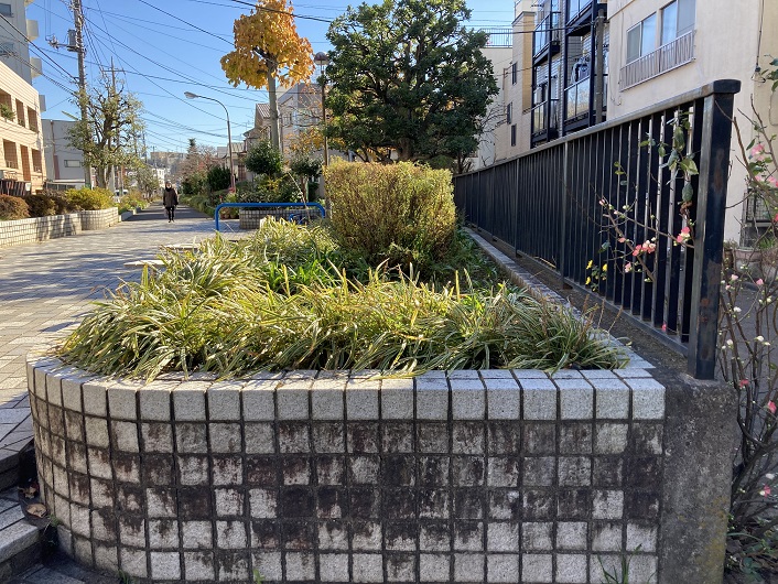 この辺りの玉川上水は暗渠になっていて、上部が遊歩道として整備されています。両側が花壇になっているのですが、右側の花壇が三田用水の流路跡のように見えます。ただ、その先は右手に分かれていて、民家に突き当たります。三田用水の流路跡の土地は売却されて民家などが建てられたようで、この民家も流路跡の土地に建てられたのかもしれません。