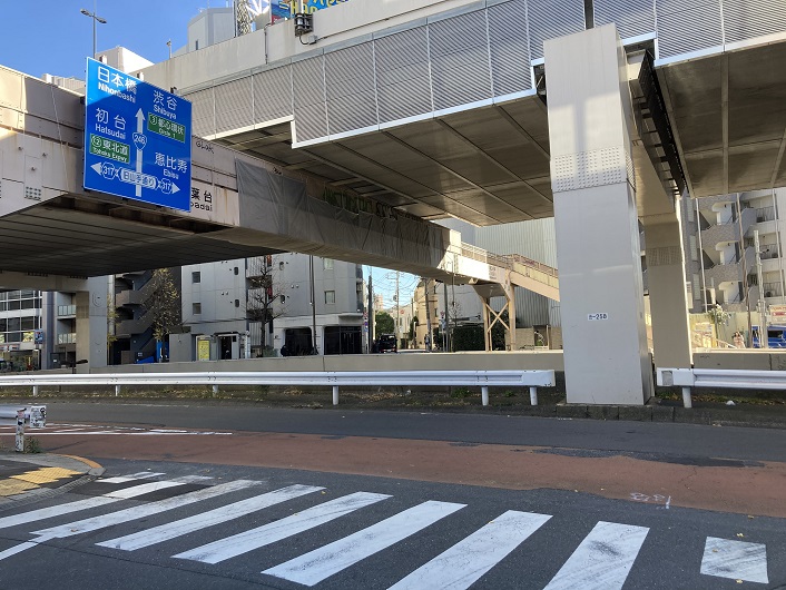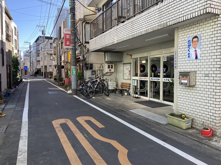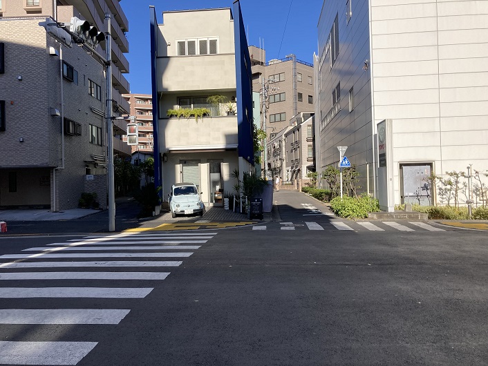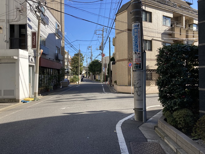 淡島通りを越えた先で国道246号玉川通りとぶつかります。玉川通りの反対側にはまた路地が延びています。