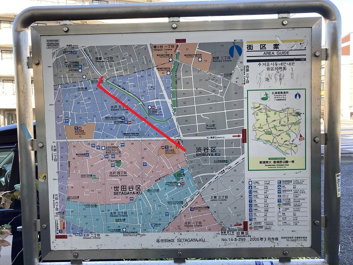 大山交差点近くにあった案内地図に、三田用水の流路跡(と思われる)を赤線で上書きしてみました。