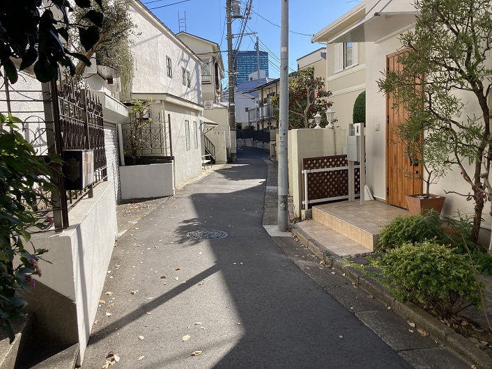 住宅地の中に消えたコンクリート製の構造物は見られなくなり、代わりに山手通りから一歩入った路地が構造物の続きのように延びています。微妙に曲がりくねっていて、人工の流路には見えませんが、恐らくは三田用水がここを流れていたものと思われます。