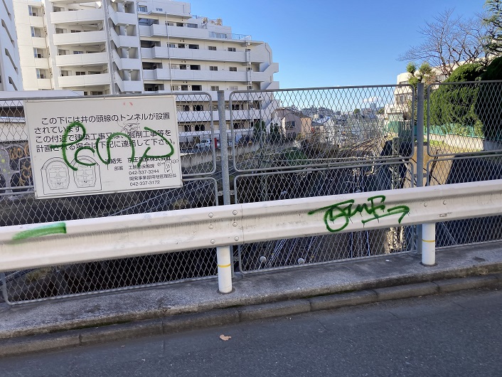 路地は井の頭線の神泉トンネルの出口辺りと交差します。といっても、井の頭線の線路は眼下に見えます。渋谷は地名の名前の如く谷底に位置するので、郊外に出るにはトンネルで抜けないといけないのです。そのトンネルよりの高い地点に三田用水が流れていたということは、用水全体の流路が渋谷川と目黒川の間の稜線に造られていたということと合致します。路地は山手通りの側壁にぶつかります。