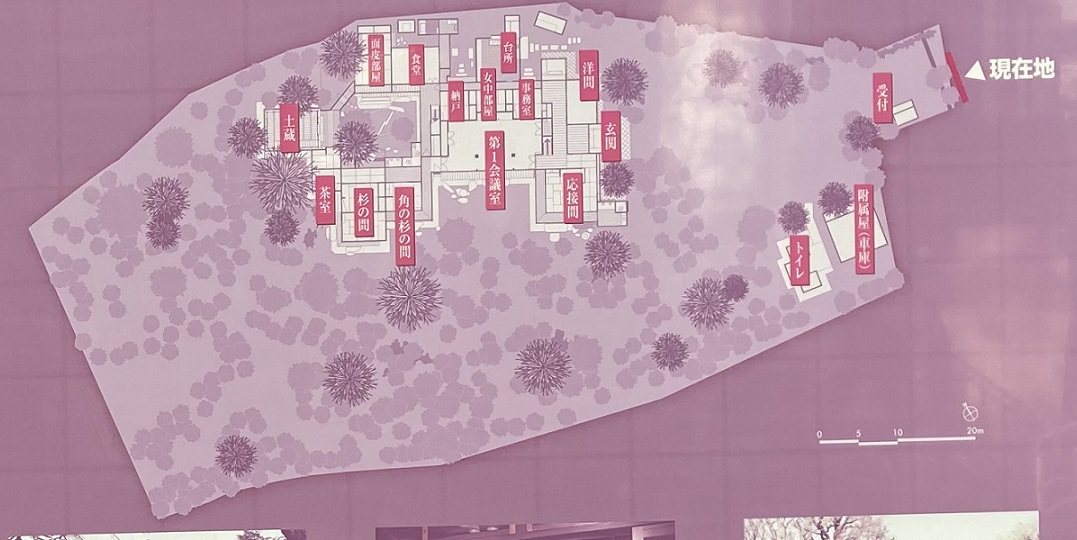 旧朝倉家住宅は、猿楽町の南西斜面を利用して東京府議会議長を務めた朝倉虎治郎によって、大正八年(1919年)に建てられました。宅地北側に主屋が建ち、西に土蔵、東に庭門や附属屋(車庫)があります。このうち、主屋・土蔵及び宅地が重要文化財です。なお、庭門及び附属屋が附(つけたり)として指定されています。主屋は、一部2階建ての主体部を中心に、接客のための応接間、内向きの座敷や茶室など、機能に応じた異なる意匠でまとめられ、土蔵は主屋に附随しています。また一体となる庭園は、崖線という地形を取り入れた回遊式庭園となっています。