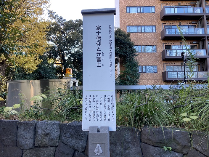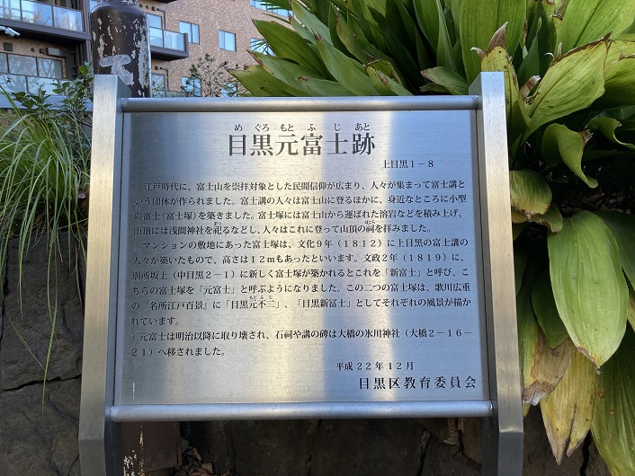 江戸時代に、富士山を崇拝対象とした民間信仰が広まり、人々が集まって富士講という団体が作られました。富士講の人々は富士山に登るほかに、身近なところに小型の富士(富士塚)を築きました。富士塚には富士山から運ばれた溶岩などを積み上げ、山頂には浅間神社を祀るなどし、人々はこれに登って山頂の祠を拝みました。マンションの敷地にあった富士塚は、文化九年(1812年)に上目黒の富士講の人々が築いたもので、高さは12mもあったといいます。文政二年(1819年)に、別所坂上(中目黒2−1)に新しく富士塚が築かれるとこれを「新富士」と呼び、こちらの富士塚を「元富士」と呼ぶようになりました。この二つの富士塚は、歌川広重の「名所江戸百景」に「目黒元不二」、「目黒新富士」としてそれぞれの風景が描かれています。元富士は明治以降に取り壊され、石祠や講の碑は大橋の氷川神社(大橋2−16−21)へ移されました。