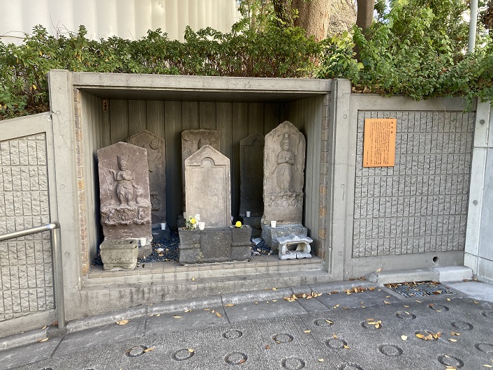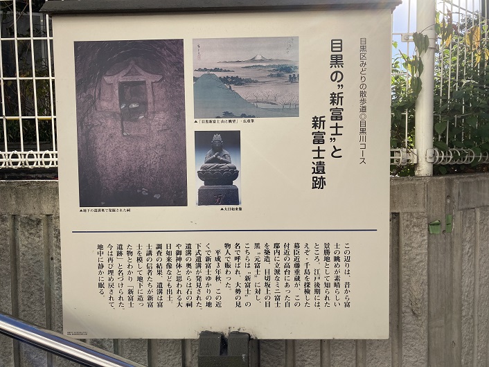 この辺りは、昔から富士の眺めが素晴らしい景勝地として知られたところ。江戸後期には、えぞ・千島を探検した幕臣近藤重蔵がこの付近の高台にあった自邸内に立派なミニ富士を築造。目切坂上の目黒“元富士”に対し、こちらは“新富士”の名で呼ばれ、大勢の見物人で賑わった。平成三年秋、この近くで新富士ゆかりの地下式遺溝が発見された。遺溝の奥からは石の祠や御神体と思われる大日如来像なども出土。調査の結果、遺溝は富士講の信者たちが新富士を模して地下に造った物とわかり「新富士遺跡」と名づけられた。今は再び埋め戻されて、地中に静かに眠る。