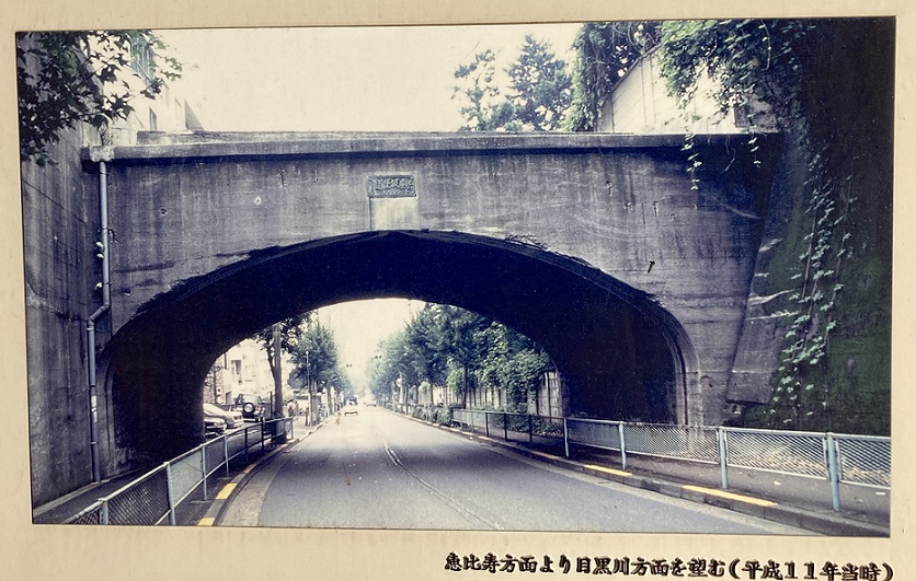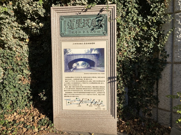三田用水は寛文四年(1664年)、飲用の上水として作られ、玉川上水から北沢で分水し、三田村を通り白金・芝へ流れていた。享保七年(1722年)この上水が廃止になった時、目黒の4か村をはじめ、14か村はこれを農業用水として利用することを関東郡代に願い出て、享保十年に三田用水となった。農耕・製粉・精米の水車などに用いられた用水も、明治以降は工場用水やビール工場の用水など、用途を変更し利用されてきたが、やがてそれる不用となり、昭和五十年にその流れを完全に止め、約300年にわたる歴史の暮を閉じた。茶屋叛隧道は、昭和五年に新茶屋坂通りを開通させるため、三田用水の下を開削してできた全長10mほどのコンクリート造りのトンネルで、平成十五年に道路拡幅に伴い撤去された。