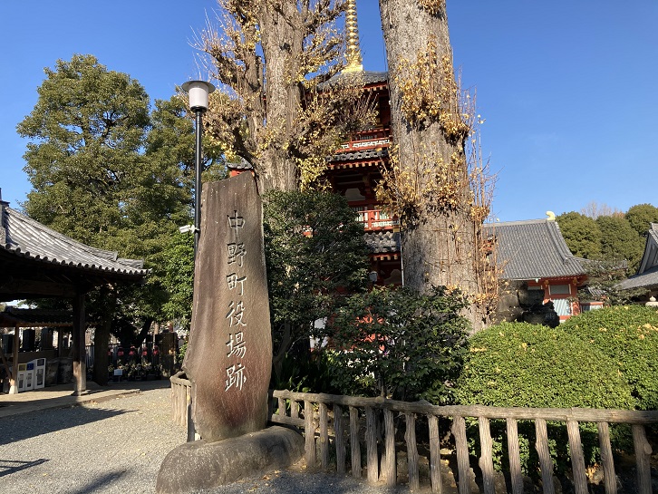 境内には中野町役場跡の石碑が建っています。明治期以降、境内には中野町役場が置かれ、その後1932年に中野区が発足したときには初代の中野区役所として利用されました。