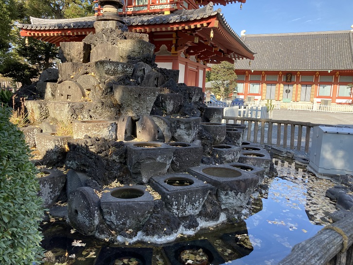 境内の一画に夥しい数の石臼が積まれ、小山のようになっています。石臼塚というのだそうです。案内板にはその由来が記されています。