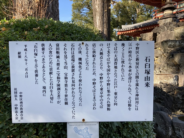 中野区と新宿区との間を流れる神田川には江戸時代から水車が設けられて、そば粉を挽くことに使われていた。そばの一大消費地となった江戸・東京に向けて玄そばが全国から中野に集められ製粉の大拠点となり、中野から東京中のそば店に供給されたため、中野そばとまで言われるようになつた。その後、機械化により使われなくなった石臼は道端に放置され見向かれなくなっていった。それを見て当山、宝仙寺第五十世住職富田コウ(”學攴”が一字になった漢字)純大僧正(宝仙学園創立者)が、人の食のために貢献した石臼を大切に供養すべきであるとして、境内に「石臼塚」を立て供養した。