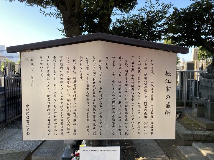 堀江家は、十二代堀江重賢の徳川幕府への届出書によれば、越前(福井県)から同家の先祖、兵部という人が農民十数名とともにこの地に来て、弘治元年(1555年)中野の開発に着手したとされています。当時、関東を支配していた小田原北条氏から小代官に任ぜられ、江戸開幕後、歴代の当主は、中野村の名主として、中野とその近郷の有力な指導者となりました。堀江家によって、中野村は次第に発展していきました。その間の村政及び幕府との関係文書は、現在「堀江家文書」として首都大学東京に保管され、研究に供されています。堀江家は、将軍鷹場の村むらへの御用触次、青梅街道中野宿の問屋場役人、組合村寄場役人のほか、江戸城内への種物・なす苗の上納など各方面に事跡を残しましたが、明治以後も中野の町村政のためにはたした業績は大きく、現在の中野区の発展の礎となっています。