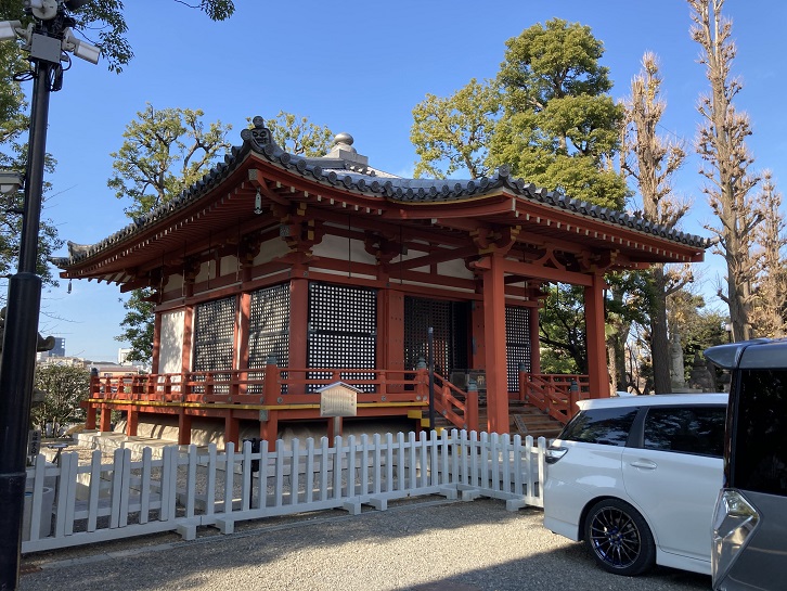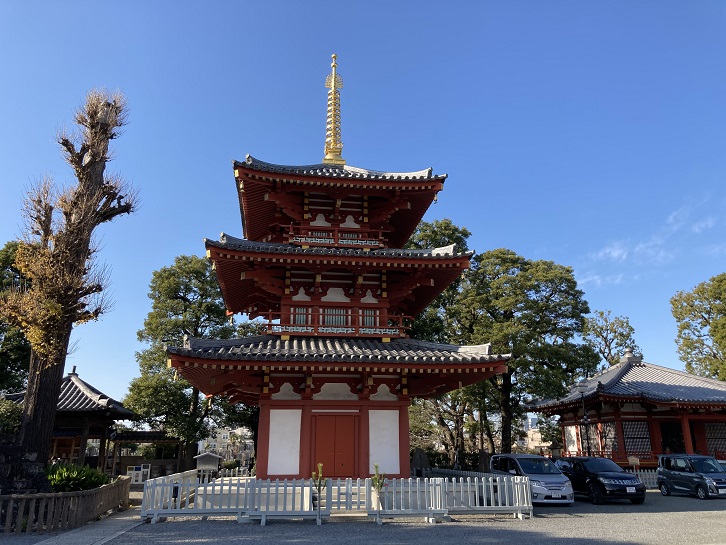 境内には朱色に映える三重塔が建っています。江戸六塔のひとつで、初代の三重塔は寛永十三年(1636年)に建立されました。昭和二十年(1945年)5月25日の空襲により焼失しましたが、平成四年(1992年)に法起寺三重塔を模した飛鳥様式で再建されました。塔内には胎蔵界五仏が安置されています。