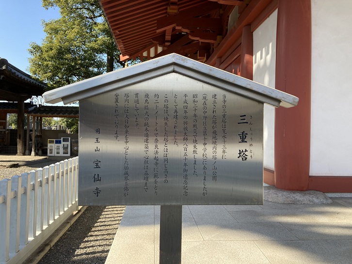 当寺の三重塔は寛永十三年に建立された塔が飛地境内の塔ノ山公園(現在の中野区立第十中学校)にありましたが、昭和二十年の戦災で焼失致しました。平成四年の興教大師八百五十年御遠忌記念として再建されました。この塔は、焼失した塔とほぼ同じ高さの約二十メートルで、奈良法起寺に範をとり、飛鳥様式の純木造建築で心柱は基壇まで貫通しています。塔内には大日如来を中心とした胎蔵界(仏の菩提心が一切を包み育成することを母胎にたとえたもの)佛が安置されております。