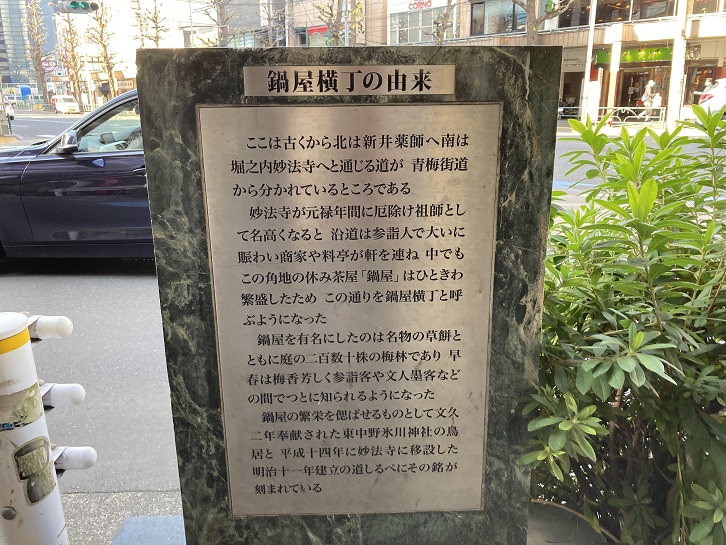 ここは古くから北は新井薬師へ南は堀之内妙法寺へと通じる道が青梅街道から分かれているところである。妙法寺が元禄年間に厄除け祖師として名高くなると沿道は参詣人で大いに賑わい、商家や料亭が軒を連ね、中でもこの角地の休み茶屋「鍋屋」はひときわ繁盛したため、この通りを鍋屋横丁と呼ぶようになった。鍋屋を有名にしたのは名物の草餅とともに庭の二百数十株の梅林であり、早春は梅香芳しく参詣客や文人墨客などの間でつとに知られるようになった。鍋屋の繁栄を偲ばせるものとして、文久二年奉献された東中野氷川神社の鳥居と平成十四年に妙法寺に移設した明治十一年建立の道しるべにその銘が刻まれている。