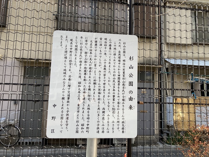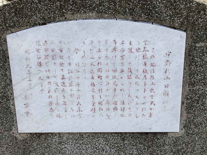 この地は杉山裁吉氏が事業界隠退後居を卜(ぼう:占う)せられたる地にして、氏は一女ありしも歿して後継なく大正十四年令室亦卒っせられし後邸地を擧げて附近児童の遊園となすべく旧中野町へ寄付を申出られ同町に於て昭和六年杉山氏逝去後之を受領せるものなり。會昭和七年十月大東京となり市域拡張されしを以て市に於て其遺志を尊重し小公園として設備し永く保存管理し以て同氏の芳志を後世に伝へんとす。
