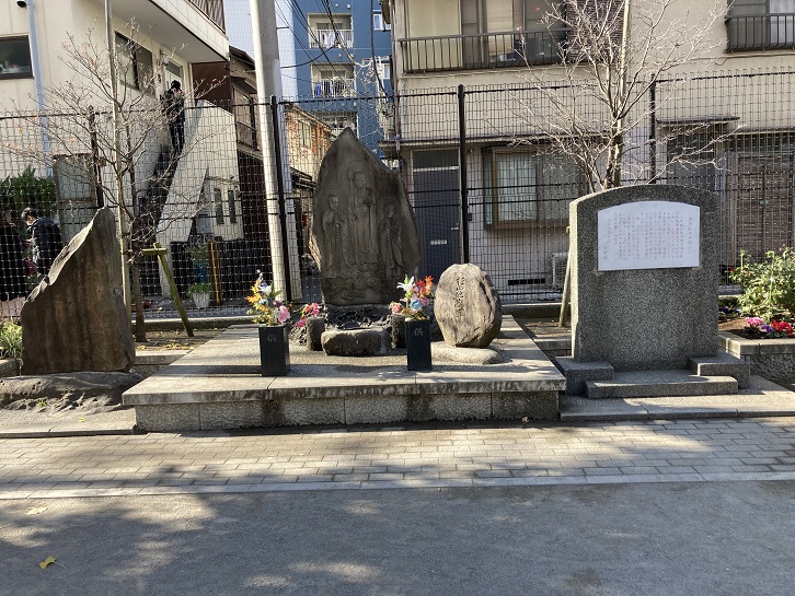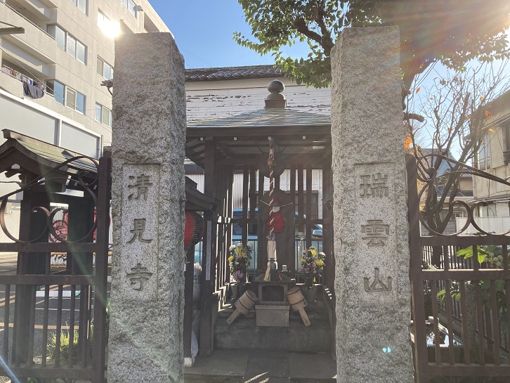 五日市街道入口交差点先の左手に清見寺があります。この一帯は昭和四十三年(1968年)に住居表示が実施される前まで馬橋という地名だったことから、通称「馬橋の灸寺」と呼ばれていました。「灸寺」という愛称は、先々代の住職に鎮灸の心得があり、檀家や近隣の人達に治療を施していたことに由来するそうです。清見寺では明治末年から灸治療が行われ、旧本堂脇の内玄関に「官許、瑞雲山清見寺、名灸点」の看板が掲げられていたそうです。灸治療は昭和五十年代まで続いていたそうですが、今はやっていないとのことです。清見寺の本堂の軒の四隅には、風鐸と呼ばれる鐘形の鈴が下がっています。山門からも見える高さ約3mの大きな石仏は、左から弘法大師、観世音薩、地蔵善薩と並んでいます。清見寺は杉並の小学校発祥の地としても知られています。明治三年(1875年)に東京府中野村(現在の東京都中野区)の宝仙寺に桃園小学校が開校しましたが、校区が広かったために清見寺に馬橋村・高円寺村・阿佐ヶ谷村・天沼村・田端村・成宗村の児童が通う分校が設けられました。毎年5・6月になると杉並第一小学校の児童が見学に訪れているとのことです。