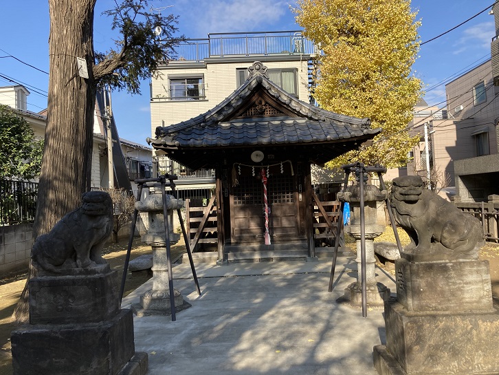 青梅街道を更に進みますと、右手に古ぼけた小さな神社が鎮座しています。祠の後に銀杏の木が聳えています。