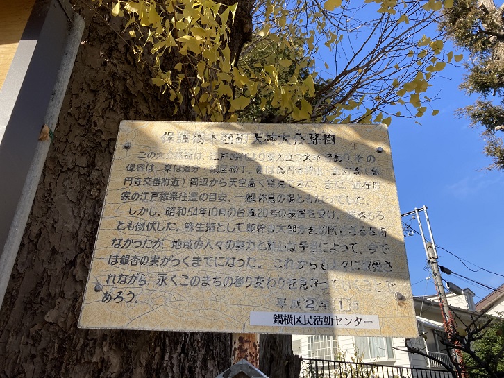 この大公孫樹は、江戸時代より聳え立つ大木であり、その偉容は、東は追分・鍋屋横町、西は高円寺押出・金灯篭(高円寺交番附近)周辺から天空高く望見できた。また、近在農家の江戸稼業往還の目安、一般休息の場ともなっていた。しかし、昭和五十四年10月の台風20号の被害を受け、根株もろとも倒伏した。蘇生策として躯幹の大部分を切断せざるを得なかったが、地域の人々の努力と熱心な手当によって、今では銀杏の実がつくまでになった。これからも人々に愛されながら、永くこのまちの移り変わりを見守っていくことであろう。
