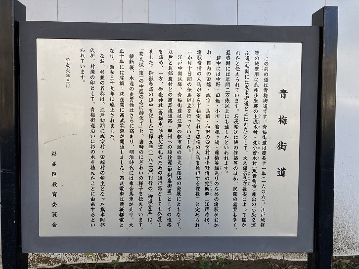 この前の道は青梅街道です。青梅街道は慶長十一年(1606年)、江戸城修築の城壁用に武州多摩郡の上成木村・北小曽木村(現青梅市)産出の石灰を運ぶ道(初期には成木街道とよばれた)として、大久保石見守長安によって開かれたと伝えられています。石灰輸送は城の修築等のほか、民間の需要も多く、最盛期には年間ニ万俵以上にも達したといわれます。道中には中野・田無・小川・箱根ヶ崎・藤橋等継送りのための宿駅がおかれ、区内の田端・成宗・馬橋・和田の四箇村は中野宿の定助郷(江戸時代、宿駅常備の人馬が足らず指定されて応援の人馬を負担する課役)と定められ、一か月十日間の伝馬継立を行っていました。江戸中期以降、青梅街道は江戸の都市域の拡大と経済の発展にともなって、江戸と近郊農村との商品流通路・甲州への脇往還(甲州裏街道)としての性格を強め、一方、御嶽神社(青梅市)や秩父巡礼のための通行路としても発展しました。御嶽参詣の道中を記した天保五年(1834年)刊行の「御嶽菅笠」は、「荻久保(窪)の中屋の店に酔伏て」と、当時のにぎわいの様子を伝元ています。維新後、本道の重要性はさらに高まり、明治時代には乗合馬車が走り、大正十年には淀橋〜荻窪間に西武電車が開通しました。西武電車は戦後都電となり、昭和三十九年に廃止されました。なお、杉並の名称は、江戸初期に成宗村・田端村の領主となった旗本岡部氏が、村境の印として、青梅街道沿いに杉の木を植えたことに由来するといわれています。