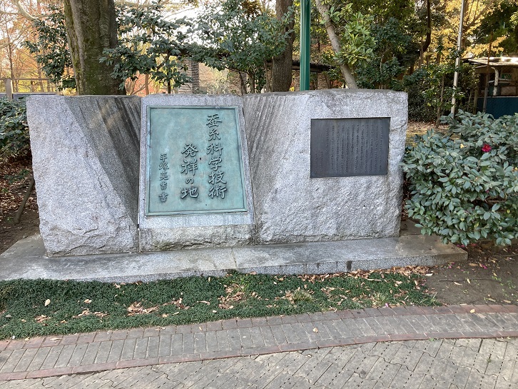 明治四十四年(1911年)、この地に農商務省原蚕種製造所が創設され、一代交雑種の原蚕種配布を開始した。その後、蚕業試験場、蚕糸試験場と改められたが、一貫して蚕糸科学技術の研究を進め、世界の先端を行く蚕糸技術を開発してきた。この業績は蚕糸業ばかりでなく、我が国の近代化と経済の発展に大きく貢献した。昭和五十五年、蚕糸試験場は筑波研究学園キ市へ移転し、杉並区立蚕糸の森公園がここに設けられた。この地に生れた蚕糸科学技術がますます発展することを願い、ここに記念碑を建立する。