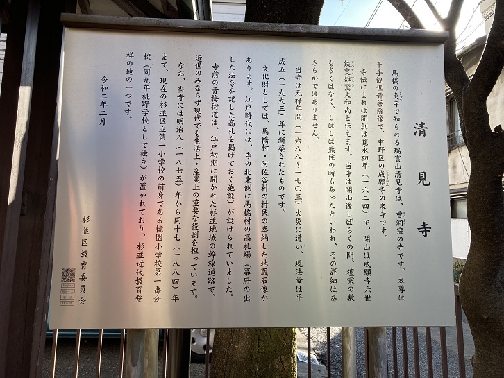 馬橋の灸寺で知られる瑞雲山清見寺は、曹洞宗の寺です。本尊は千手観世音菩薩像で、中野区の成願寺の末寺です。寺伝によれば開創は寛永初年(1624年)で、開山は成願寺六世鉄叟雄「さく」(茲の下に鳥)大和尚と伝えます。当寺は開山後しばらくの間、檀家の数も多くはなく、しばしば無住の時もあったといわれ、その詳細はあきらかではあません。当寺は元禄年間(1688年〜1703年)火災に遭い、現法堂は平成五年(1993年)に新築されたものです。文化財としては、馬橋村・阿佐谷村の村民の奉納した地蔵石像があります。江戸時代には、寺の北東側に馬橋村の高札場(幕府の出した法令を記した高札を掲げておく施設)が設けられていました。寺前の青梅街道は、江戸初期に開かれた杉並地域の幹線道路で、近世のみならず現代でも生活上・産業上の重要な役割を担っています。なお、当寺には明治八年(1875年)から同十七年(1884年)まで、現在の杉並区立第一小学校の前身である桃園小学校第一番分校(同九年桃野学校として独立)が置かれており、杉並近代教育発祥の地の一つです。
