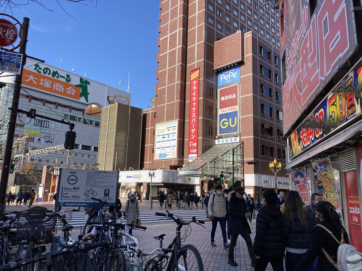 西武新宿駅前の靖国通り上にあった新宿駅電停跡に来たのは都電11系統・12系統と今回歩く都電13系統の3回で、今日が最後となります。正確にいうと、新宿駅と荻窪駅の区間を走っていた都電14系統の新宿駅電停が昭和の初期に現在の新宿駅東口ルミネ前あたりにがあったそうですが、戦時中に新宿駅西口に移動したらしいです。現在のルミネ前にあった(と思われる)新宿駅から大ガード下を通って青梅街道に入ったようなので、11・12・13系統とは線路と電停の共有はありませんでした。何より、14系統は狭軌(1067mm)の線路を使用していたために、11・12・13系統の準広軌(1272mm)の線路とは繋がりようがなかったのです。それはそれとして、(既に閉店しましたが)大塚家具の広告が掲げられた旧ヤマダ電機LABI新宿東口館の建物前から都電13系統跡の歩きを始めます。