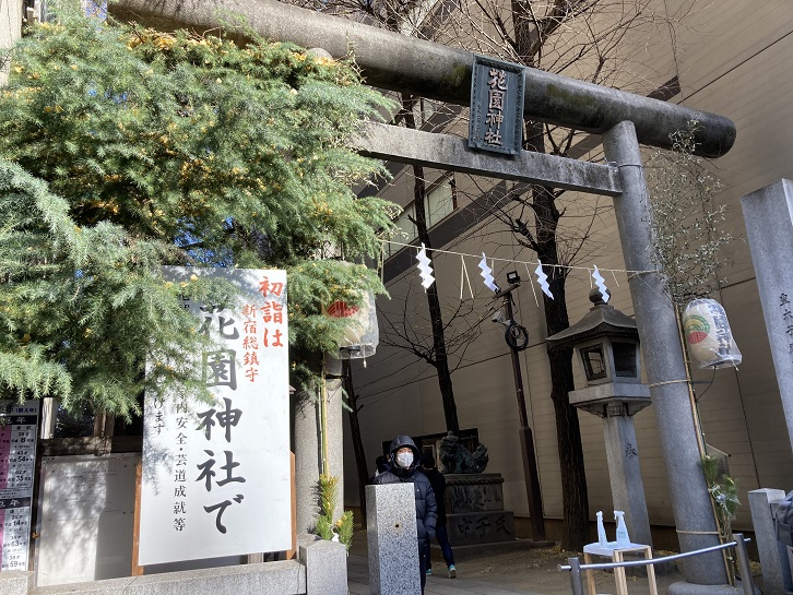 新宿五丁目交差点を左折し、少しの距離ですが明治通りを進みます。明治通りに面して花園神社の裏門(こちらが正門?)があります。11月の酉の市の季節になると、参道横の空き地には熊手で覆われた小屋が密集して建ち並びます。参道の奥の一段高いところには朱色に塗られた拝殿が鎮座しています。花園神社は創建以来、幾度も大きな火災に見舞われ、その度に社殿を再建してきました。戦後社殿が老朽化したため、昭和四十年6月に鉄筋コンクリート造りの社殿が完成し、現在に至っています。